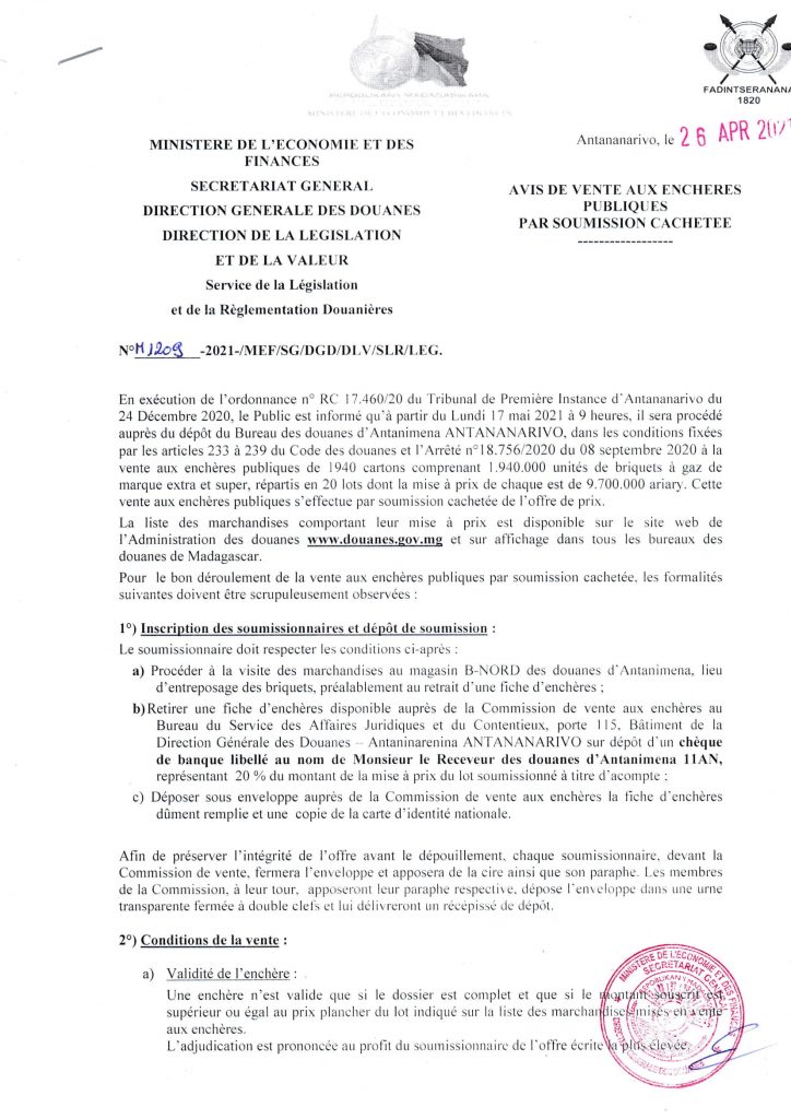 En exécution de l’ordonnance n° RC 17.460/20 du Tribunal de Première Instance d’Antananarivo du 24 décembre 2020, le Public est informé qu’à partir du Lundi 17 Mai 2021 à 9 heures, il sera procédé auprès du dépôt du Bureau des douanes d’Antanimena Antananarivo, dans les conditions fixées par les articles 233 à 239 du Code des douanes et l’Arrêté n°18.756/2020 du 08 septembre 2020 à la vente aux enchères publiques du 1940 cartons comprenant 1.940.000 unités de briquets à gaz de