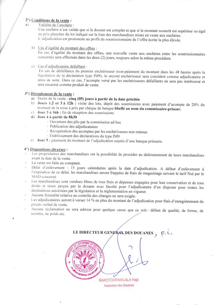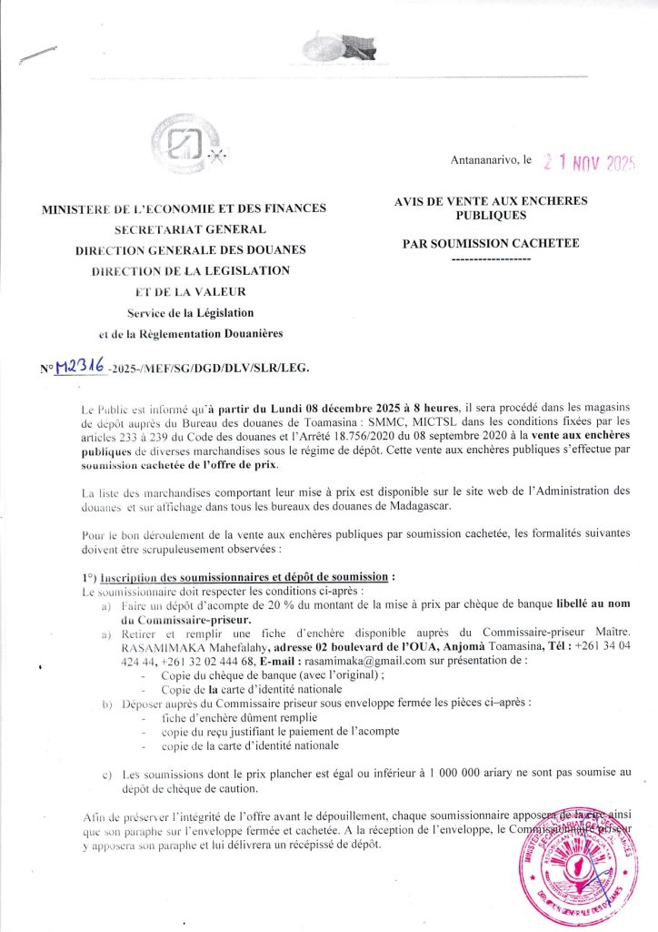 - Avis de vente aux enchères publiques sous conditions par soumission cachetée No : M2316-2025/MEF/SG/DGD/DLV/SLR/LEG