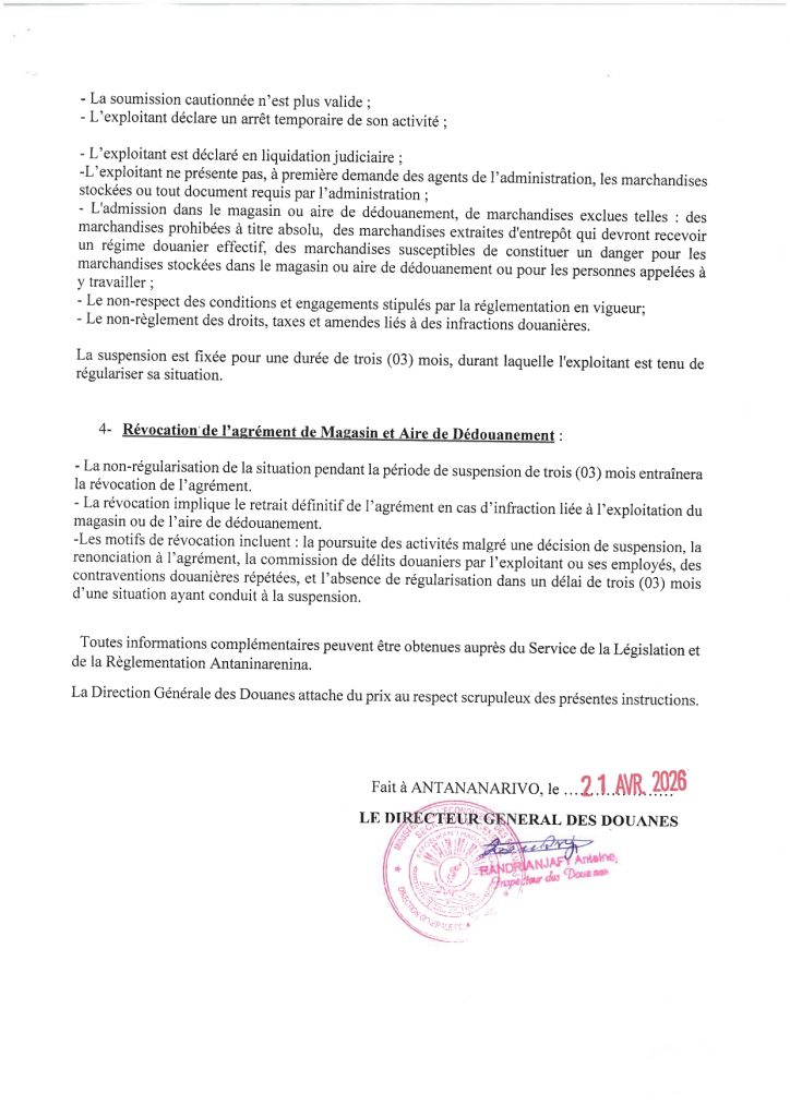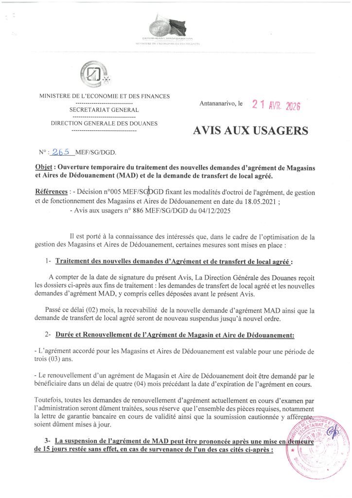 - Ouverture temporaire du traitement des nouvelles demandes d'agrément de Magasins et Aire de Dédouanement (MAD) et de la demande de transfert de local agréé