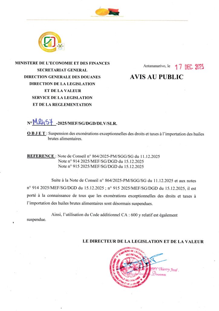 Suspension des exonérations exceptionnelles des droits et taxes à l’importation des huiles brutes alimentaires
