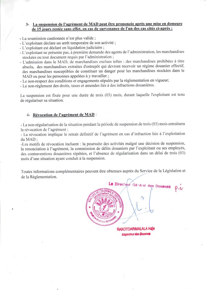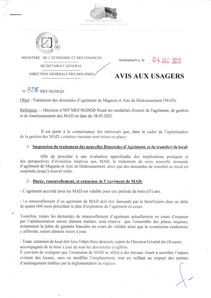 Traitement des demandes d’agrément de Magasin et Aire de Dédouanement (MAD)