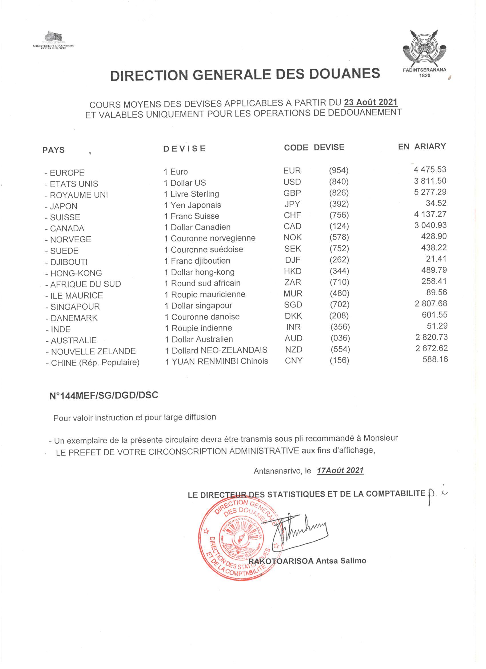- Cours moyens des devises applicables à partir du 23/08/2021