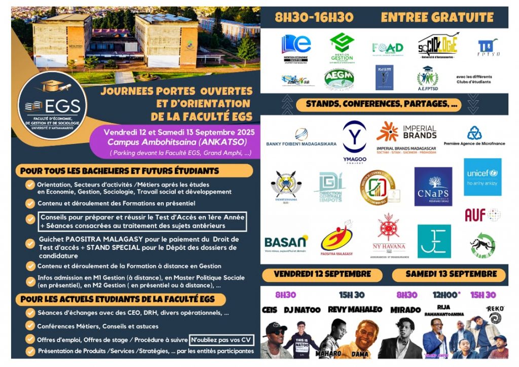 La Douane Malagasy a le plaisir d’annoncer sa participation aux Journées Portes Ouvertes de la Faculté d’Économie, Gestion et Sociologie de l’Université d’Antananarivo, qui se tiendront les 12 et 13 septembre 2025 dans l’enceinte de ladite faculté.