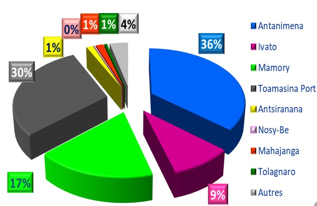 Sur les 19 800 DAU environ enregistrés dans Sydonia en octobre 2025 : 36% à Antanimena, 30% à Toamasina Port, 17% à Mamory, 9% à Ivato et moins de 2% pour chacun des autres bureaux.